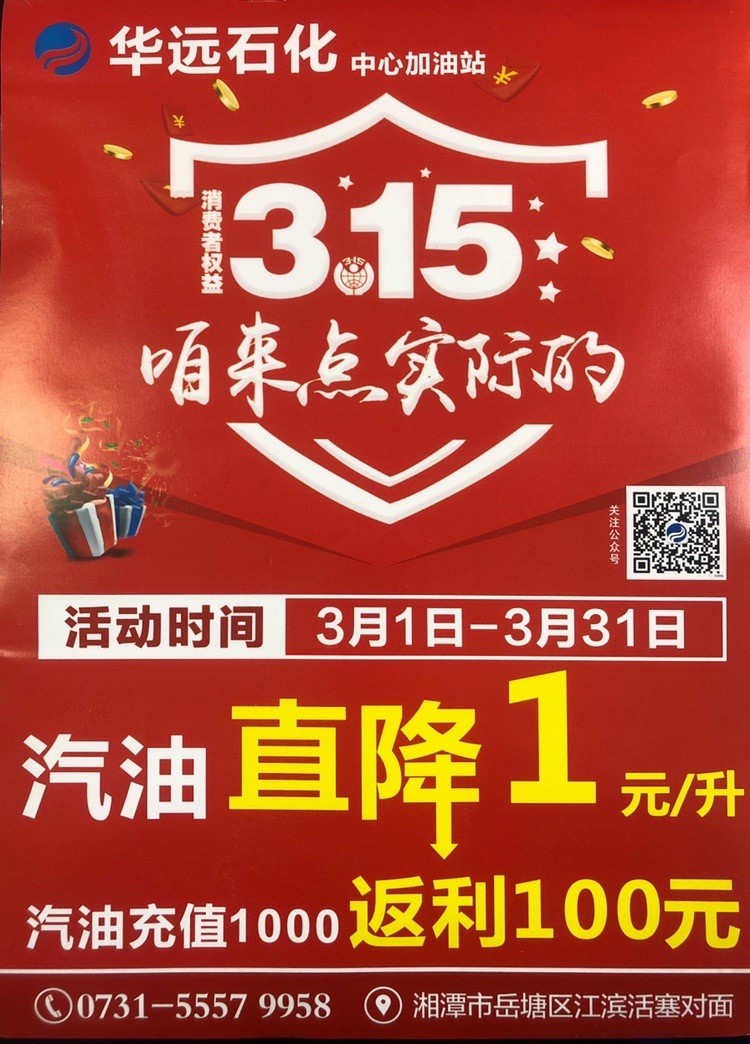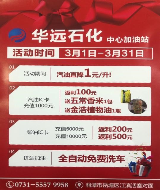 2020年3月疫情得到控制以后,湖南華遠(yuǎn)石化有限公司響應(yīng)政府號召,支持湘潭市各企業(yè)開展復(fù)工復(fù)產(chǎn)工作,在湘潭市中心加油站率先推出油品單價(jià)掛牌價(jià)直降1元的優(yōu)惠活動,讓利社會,回報(bào)大眾。另外持華遠(yuǎn)石化加油卡充值優(yōu)惠返利10%,活動時(shí)間3月份,長達(dá)一個(gè)月,此外充值還贈送東北五常大米,金浩茶油等基本生活物資。