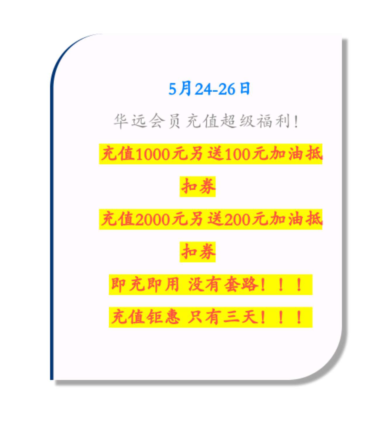 新站開(kāi)業(yè)鉅惠僅限3天!5月24-26日充值1000送100,會(huì)員日最高優(yōu)惠1元/升!衡陽(yáng)車(chē)主福利最多?。。?/h1>
